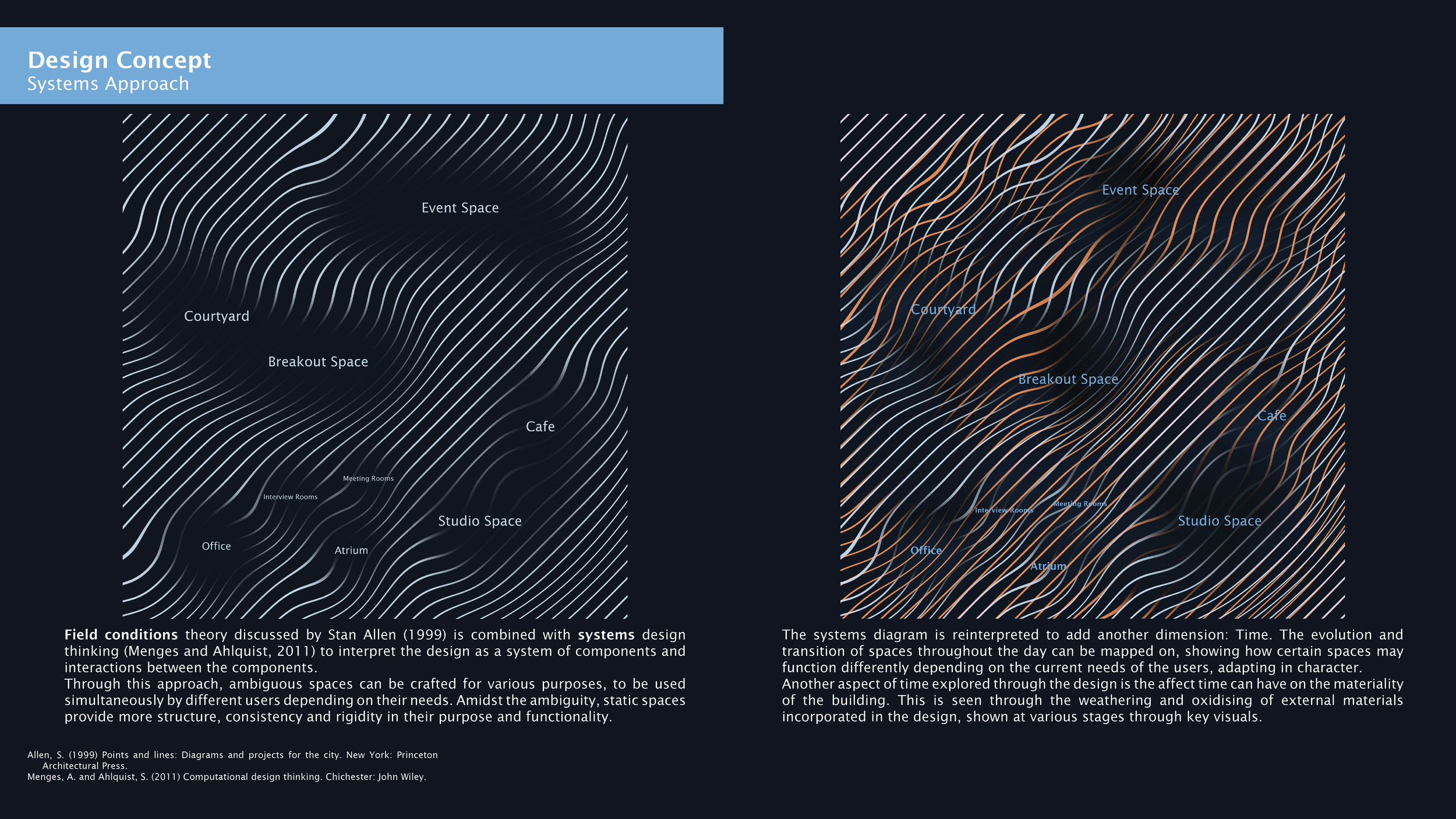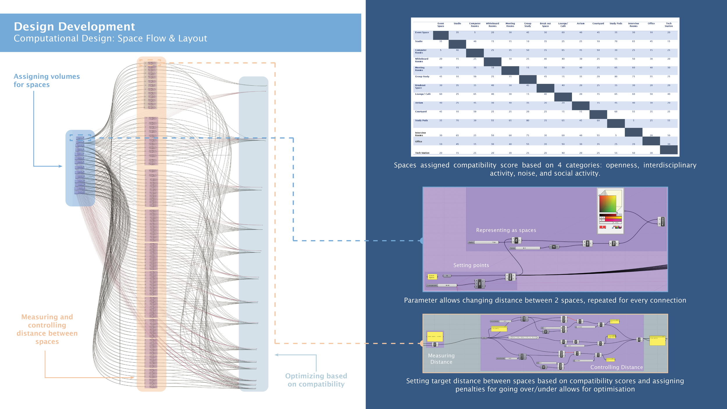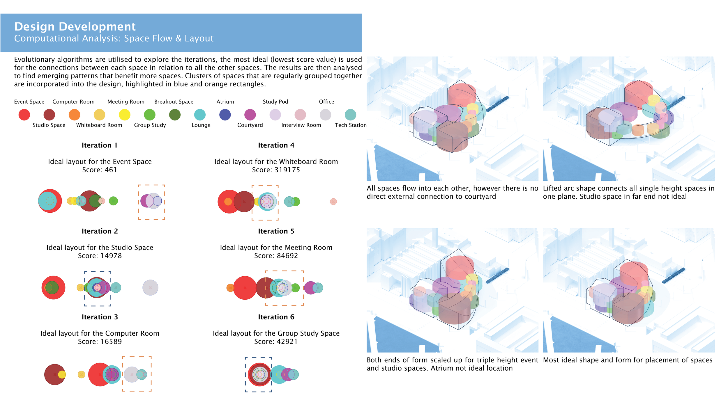 Through multiple design iterations, a spatial strategy was developed to explore the layout of space and identify a successful flow. These iterations were supported through the use of computational design tools and evolutionary algorithms.